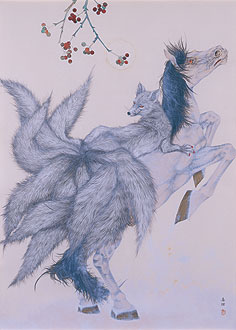 九尾白狐馬乗図は、九本という陽の最大数の尾を持つ狐が、常に午に助けられ、白い為に常に金を生むという画である。頭上の赤く丸い実は金気を意味し、より強い金気を強調した。雪の白も西の方角、強大な金気を意味する。狐は本来、陰の動物なので、夜の陰の満月の夜、極陽を担っている午に乗る事により、陰陽を満たして世の中が動く。金気を意味する西の方角は、易では沢、つまり少女を意味する。この白狐は、少女の役も担っている。少女の本質も金気を隠している。