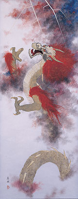 東京は、東の都である。 東の方角とは、陽の昇る処、物の始まりを意味する。 陽は東から昇り、光と暖かさで、五穀を豊穣に導く。 また古来龍は水神として崇められて、その本質は天高く昇るとされている。 龍とともに天高く昇った水が地を潤して東から昇る陽のお陰で豊かな実りを頂く。 昇龍図は、水を治めて陽の恵みに感謝し五穀の豊穣を祈願して描いたものである。