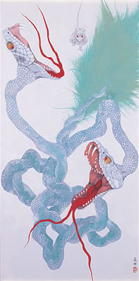 祖先から受け継ぐ心の拠り所としての竜蛇神と実りの子を五穀豊穣と海の幸を祈願して描いた。