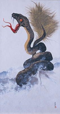 出雲の浦に海神の使いの龍蛇が上るが、その姿は背黒腹黄、尾に神紋の扇を負うとされている。龍蛇はトグロを巻き、火を吐くような大口を開けて、穢れを追い払う。