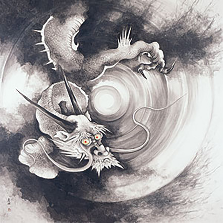 龍は古来、水神様として崇められてきた神獣で、変幻自在です。天高く上り、地に下り、龍が動くことで気流が生まれて地が潤うと信じられていました。黒は、陰陽五行で水を表わす色です。そして祖先を 表わす色でもあります。祖先から続く龍の信仰を今に伝えるために、「黒龍図」を描き表わしました。眼をのみ日本の色である赤で描きましたが、水を大切にする思いから、水を汚すことのない墨という素材を使い、水の流れ、気の流れを描き記し、鱗の一つにまで想いを込めました。